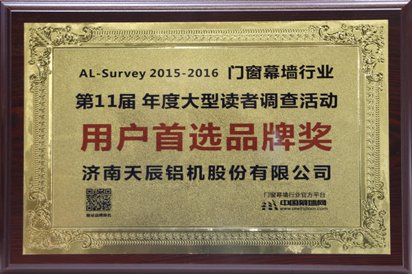 同期,由中國建筑金屬結(jié)構(gòu)協(xié)會主辦,中國幕墻網(wǎng)承辦的“第十一屆AL-Survey2015-2016中國幕墻網(wǎng)年度大型讀者調(diào)查評選活動”頒獎儀式在在廣州廣交會威斯汀酒店隆重舉行,天辰股份榮獲“用戶首選品牌獎”。