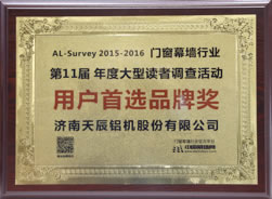 ???? 同期,由中國建筑金屬結(jié)構(gòu)協(xié)會主辦,中國幕墻網(wǎng)承辦的“第十一屆AL-Survey2015-2016中國幕墻網(wǎng)年度大型讀者調(diào)查評選活動”頒獎儀式在在廣州廣交會威斯汀酒店隆重舉行,天辰股份榮獲“用戶首選品牌獎”。