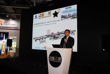 展會期間,在第二屆中國門窗幕墻年度星品評選中,天辰股份的數(shù)控四頭組角生產(chǎn)線以其填補(bǔ)國內(nèi)空白的先進(jìn)的技術(shù)及超高生產(chǎn)效率,獲得評審及專家的一致好評,勇奪“星品獎”。天辰股份市場部傅旺經(jīng)理在星品發(fā)布會上對該設(shè)備進(jìn)行了詳盡的技術(shù)闡述。
